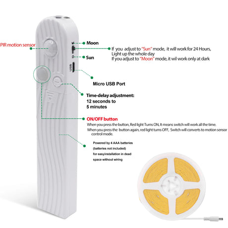 Battery Powered8MM COB Multi Color Led Strip 5V with Motion Sensor 320LEDs/M Led Induction