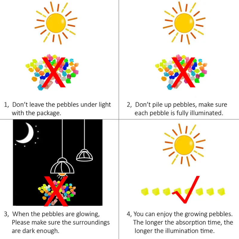 4.You can enjoy the glowing pebbles,the longer the absorption time , the longer the illumination time .