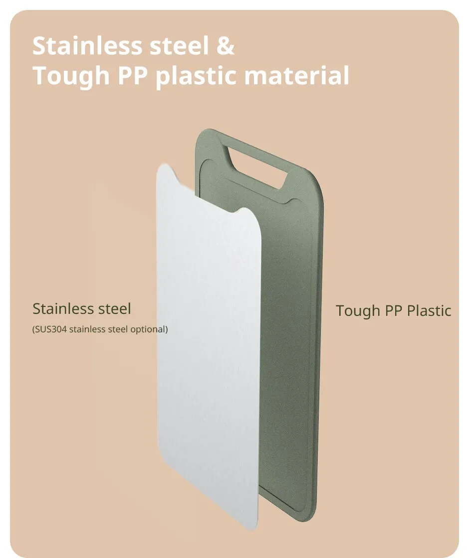 This cutting board is composed of two different materials, one side is made of PP plastic and the other side is made of stainless steel. You can cut vegetables and fruits on the plastic side; You can cut meat on the stainless steel side.