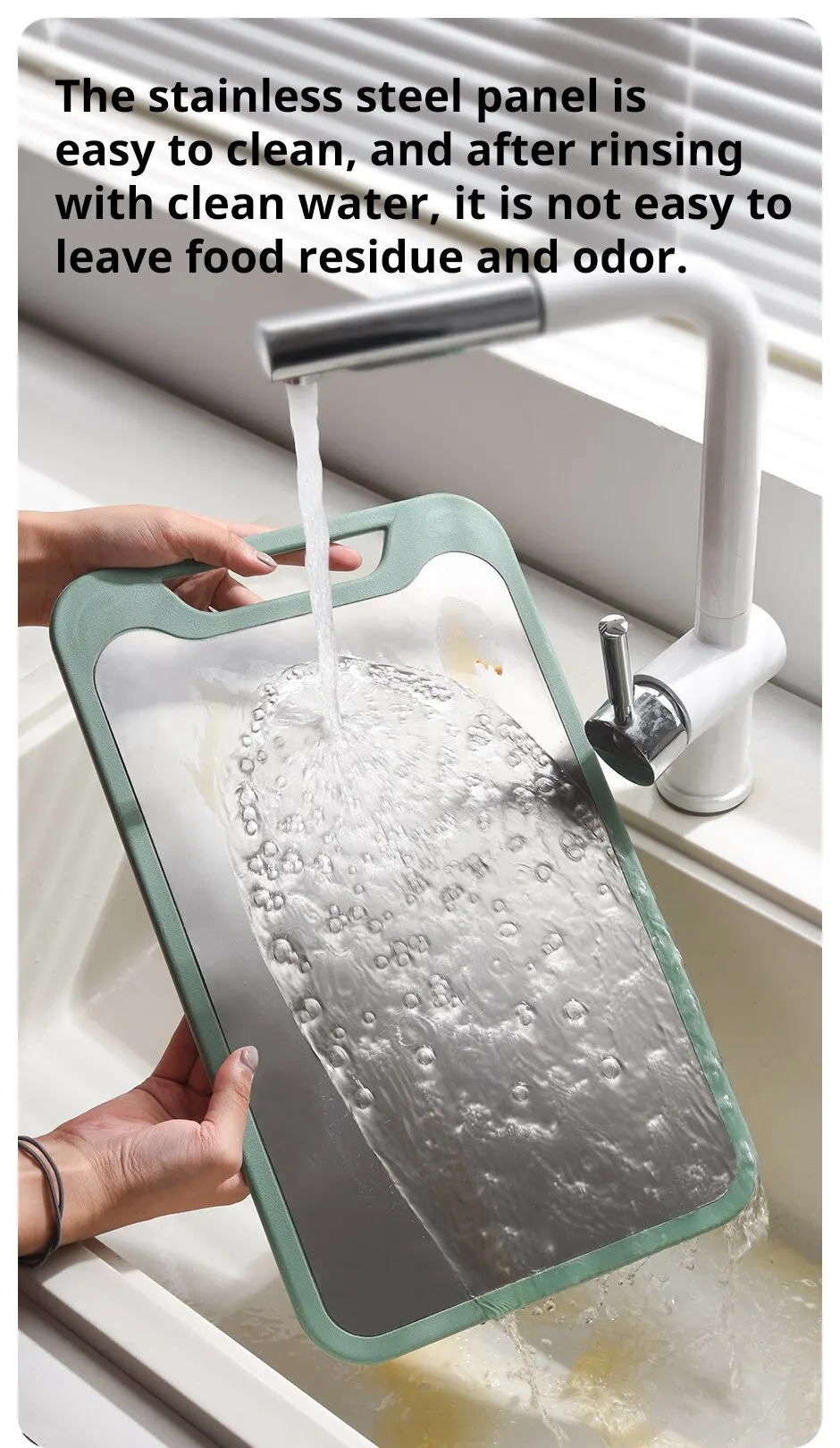4.The stainless steel panel is easy to clean, and this cutting board can be hung up during storage.