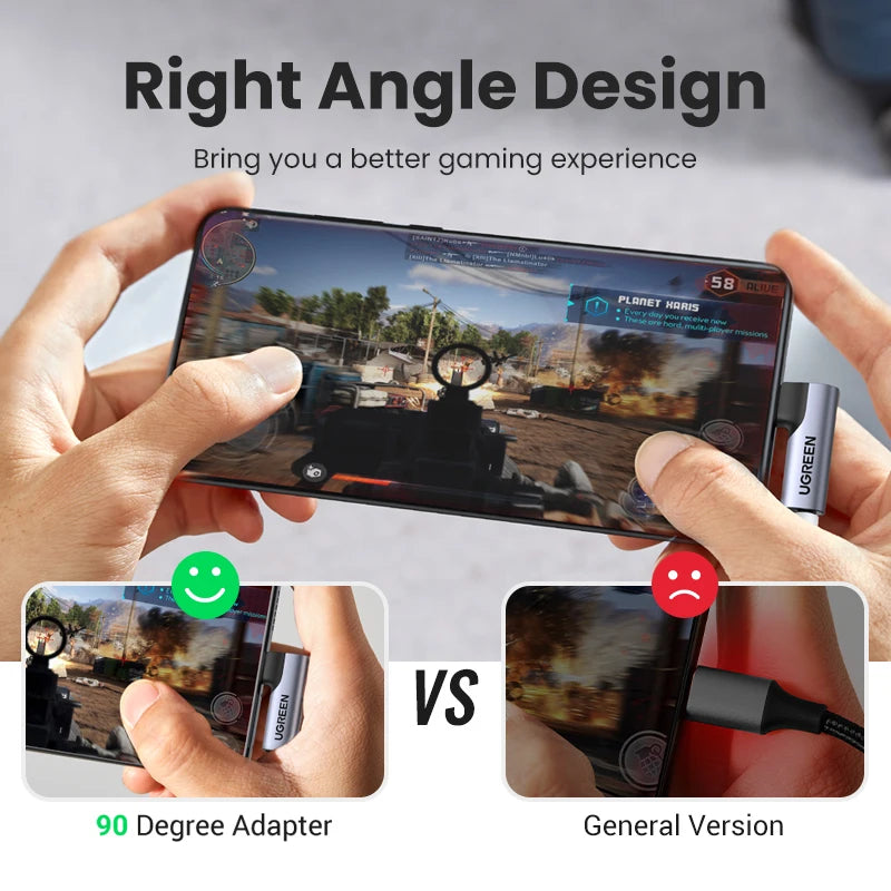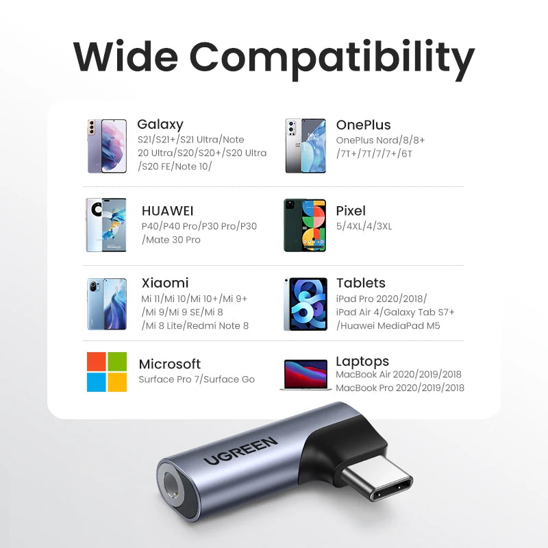 More Upgraded Durability: UGREEN USB C Headphone Jack Adapter with 90° angle bent ergonomics design, can help prevent your cables from being damaged. The aluminum housing resists oxidation & corrosion. You can put the phone horizontally or vertically and the jack connector doesn't get in the way