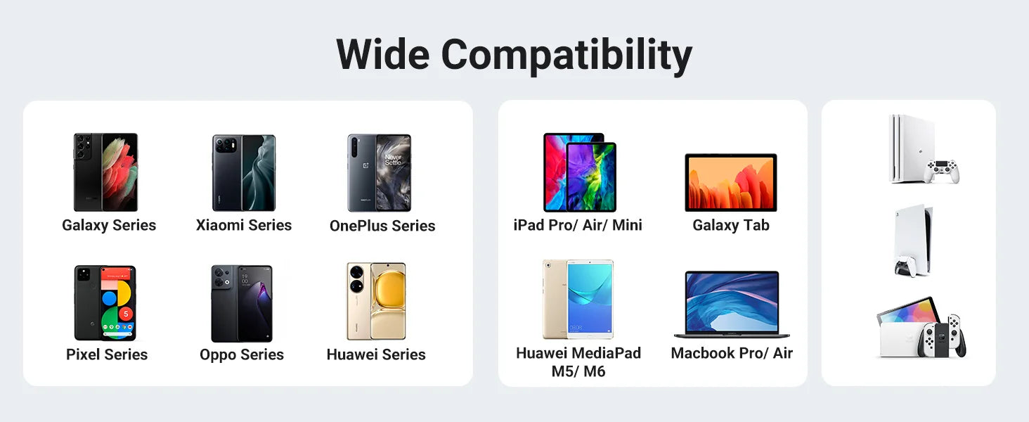 Fit for 2: for Samsung Ultra/S21+/S21/S20 FE/S20 Plus/S20 Ultra/S10 Lite/Note20/Z Flip 3/, Google Pixel 6/6 Pro/5a/5/5 Pro, Nord 2/9 Pro/8T/7, MacBook Pro, most Type-C devices